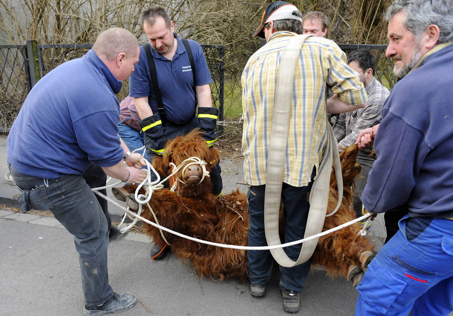 3月18日,德國一頭蘇格蘭高地牛來到一居民院內(nèi)懶洋洋的曬太陽,最后經(jīng)過獸醫(yī)的麻醉和消防員協(xié)力才將這頭蠻力十足的家伙“制服”。圖片來源:中國新聞網(wǎng)