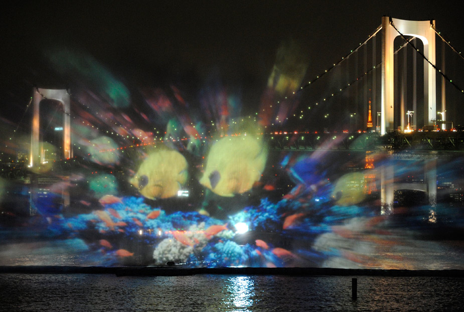 3月19日晚,在日本東京灣上演了一場(chǎng)美輪美奐的“海上幻燈”。東京灣的噴泉噴射出長(zhǎng)60米、高23米的各種海洋生物的畫面,令人驚嘆。