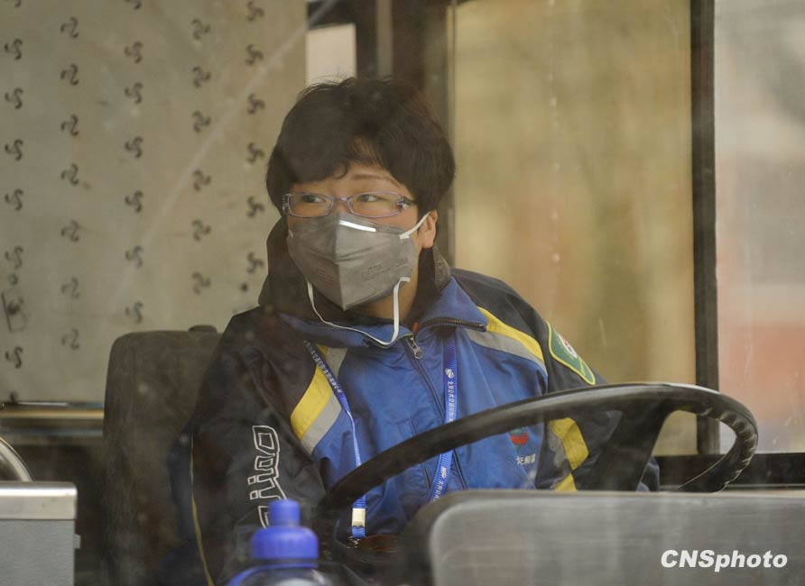 3月20日,春季首場重度浮塵天遮蓋了整個(gè)北京城。圖為一位公交車司機(jī)戴上防塵口罩。中新社發(fā) 廖攀 攝