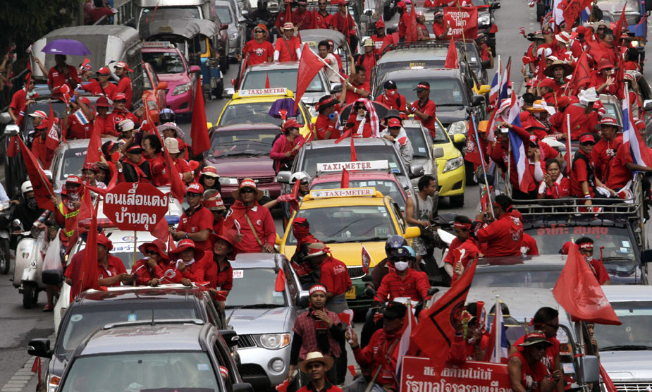 泰國(guó)紅衫軍20日號(hào)召數(shù)千輛汽車(chē)上街,在曼谷大游行,路線總長(zhǎng)約45公里,橫跨曼谷多條主要街道,勢(shì)要癱瘓曼谷。圖片來(lái)源:中國(guó)新聞網(wǎng)