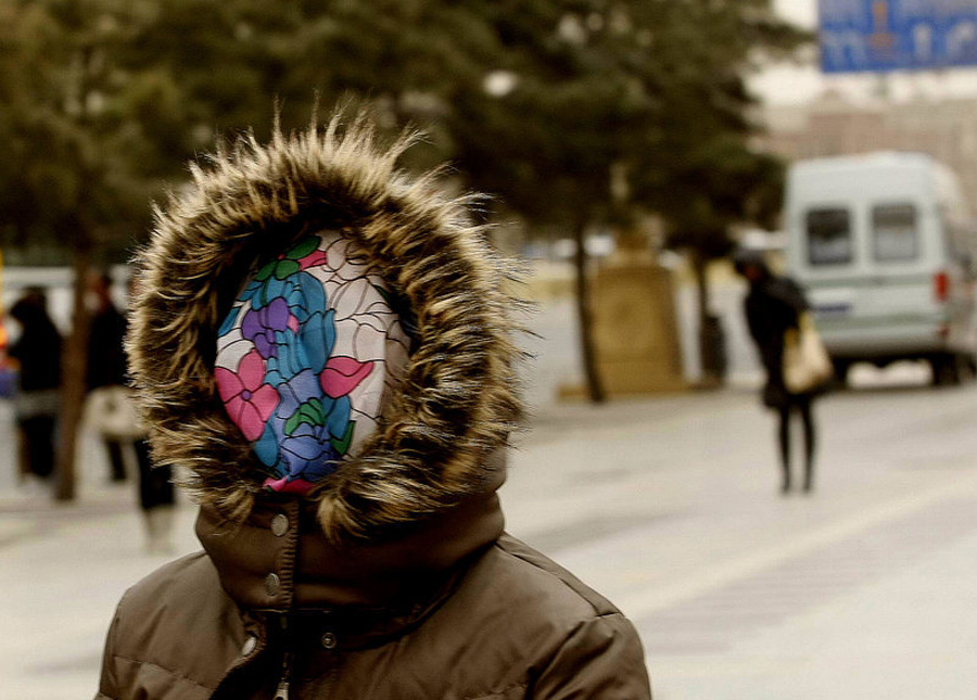 20日,北京遭遇4年來最強浮塵襲擊。一位行人將自己用紗巾“武裝”起來。