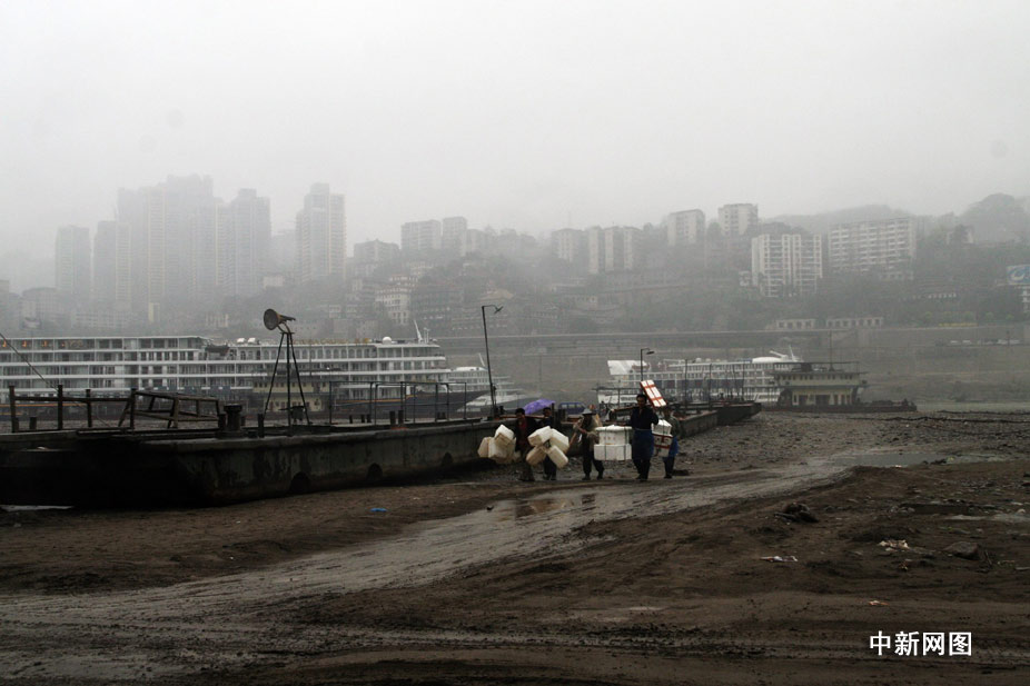 3月23日,重慶市朝天門嘉陵江與長江交匯處大面積河床裸露出來,部分水段已見底。圖片來源:中國新聞網
