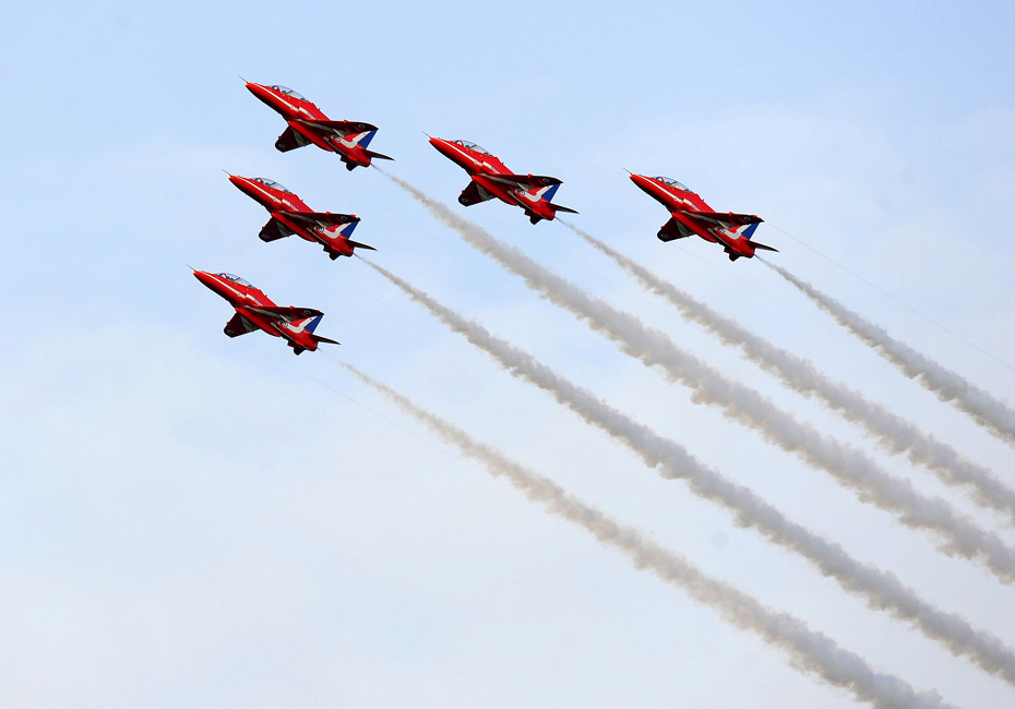 圖為英國(guó)“紅箭”特技飛行隊(duì)訓(xùn)練的資料圖片。