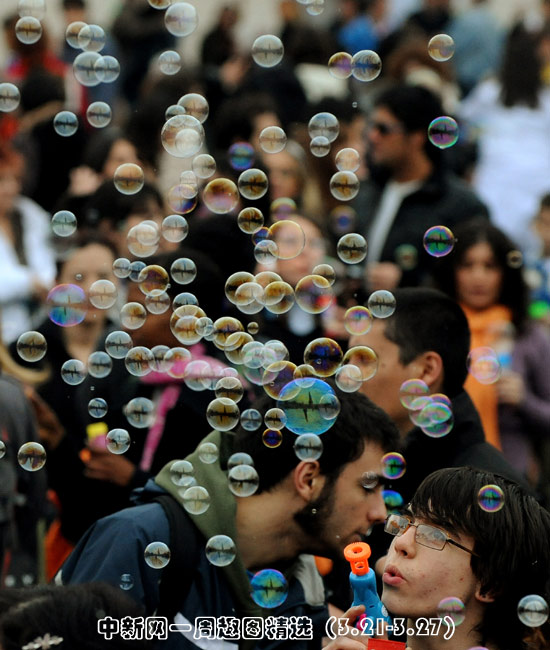 3月21日,在意大利羅馬城中的波波洛廣場,參加“快閃”族聚會的人們吹泡泡迎接春天的到來。圖片來源:中國新聞網(wǎng)>>點擊觀看詳細內(nèi)容