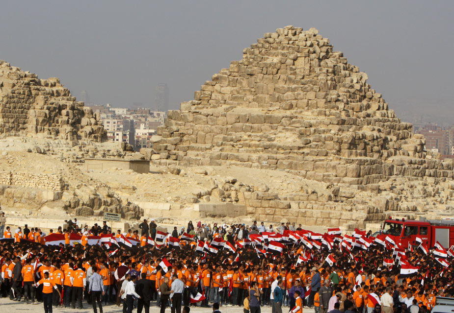 3月26日,4550名埃及兒童在首都開(kāi)羅市郊的胡夫金字塔前揮舞埃及國(guó)旗,創(chuàng)造了在同一地點(diǎn)集體揮舞國(guó)旗的吉尼斯世界紀(jì)錄。