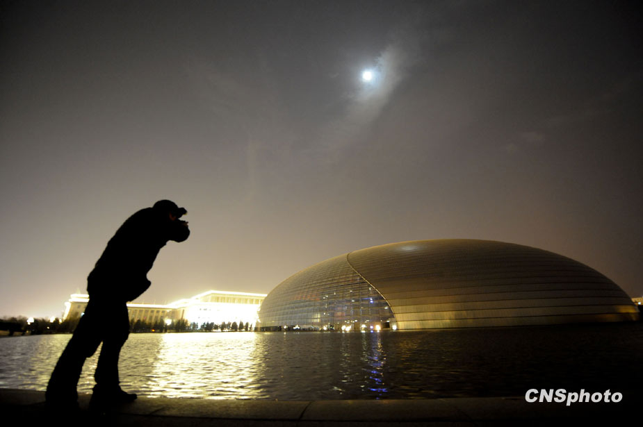 3月27日20點30分,北京國家大劇院關閉外景燈光,參與全球“關燈一小時”活動。圖為記者關注熄燈后的國家大劇院。中新社發(fā) 廖攀 攝