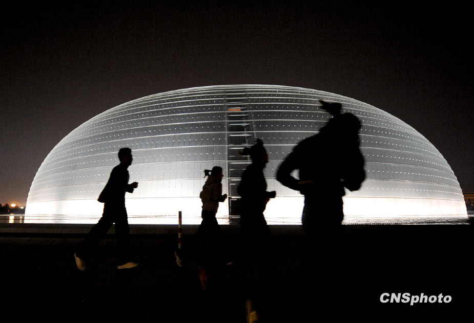 3月27日20點16分,熄燈前許多青年在燈火通明的國家大劇院周圍鍛煉。中新社發(fā) 廖攀 攝