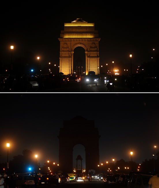 由世界自然基金會發(fā)起的“地球一小時”環(huán)保活動27日20點30分按照時區(qū)依次在全球數(shù)千個城市展開。圖為印度門在熄燈前和熄燈后的景色。