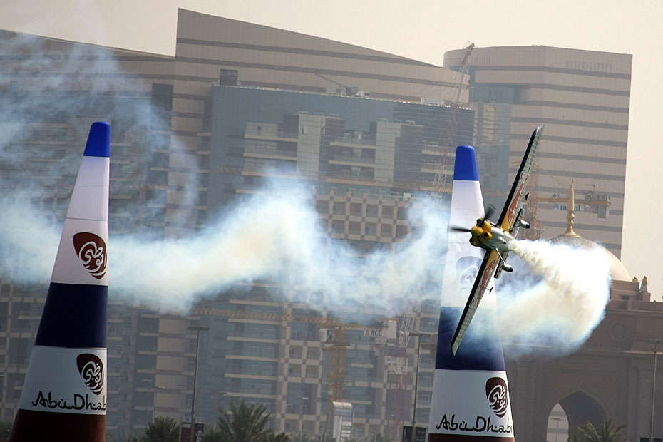 近日,紅牛飛行系列賽世界錦標(biāo)賽預(yù)選賽在阿拉伯聯(lián)合酋長國阿布扎比舉行。參加比賽飛行員不但要有高速的駕駛技術(shù),還要有勇往直前的膽量。圖片來源:中國新聞網(wǎng)