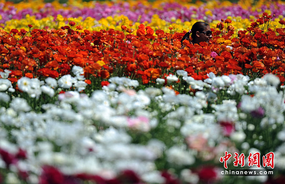 美國加利福尼亞州圣迭戈的卡爾斯巴德花田近日繁花盛開,姹紫嫣紅的花朵整齊地鋪滿在五十英畝的土地上,一望無垠的花海,美不勝收。圖片來源:中國新聞網(wǎng)