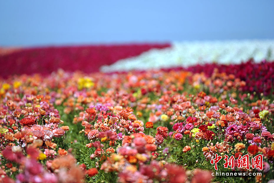美國加利福尼亞州圣迭戈的卡爾斯巴德花田近日繁花盛開,姹紫嫣紅的花朵整齊地鋪滿在五十英畝的土地上,一望無垠的花海,美不勝收。圖片來源:中國新聞網(wǎng)