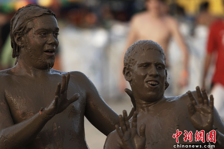 當?shù)貢r間4月1日,以色列南部的海灘上,眾多年輕人在泥漿中盡情玩耍,慶祝為期三天的逾越節(jié)。圖片來源:中國新聞網(wǎng)