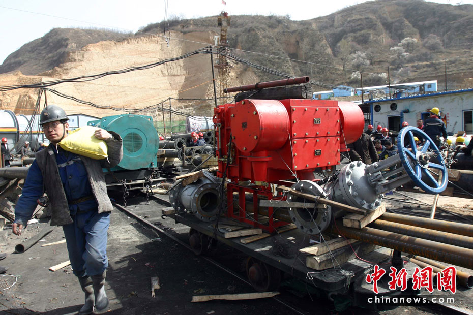 4月1日,“3·28”山西王家?guī)X透水事故進(jìn)入第五天,由于排水進(jìn)度緩慢,搜救人員還無(wú)法下井施救。圖為即將運(yùn)送井下安裝的排水設(shè)備。中新社發(fā) 張?jiān)?攝