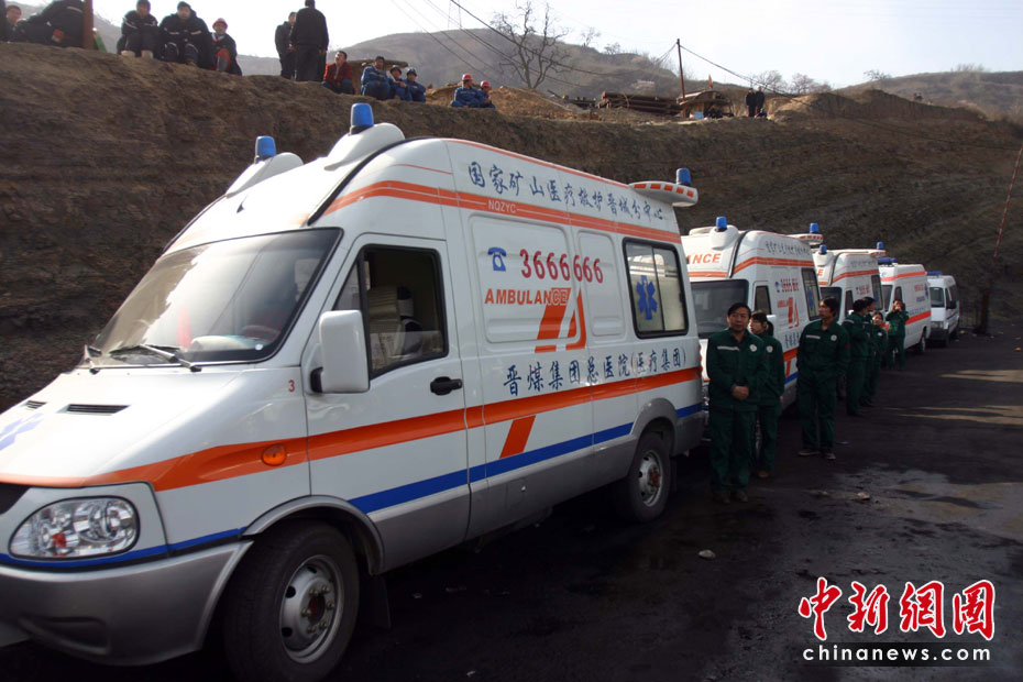4月3日上午,華晉焦煤公司王家?guī)X礦透水事故第七天,在得到井下有強烈生命反應(yīng)的搶險人員士氣上得到了極大鼓舞,正在繼續(xù)加大力度排水,現(xiàn)已排水已達到每小時1935立方米,水位線下降5.3米,緊急救護車已到現(xiàn)場24小時待命,隨時準備急救從井下獲救的礦工。中新社發(fā) 張云 攝