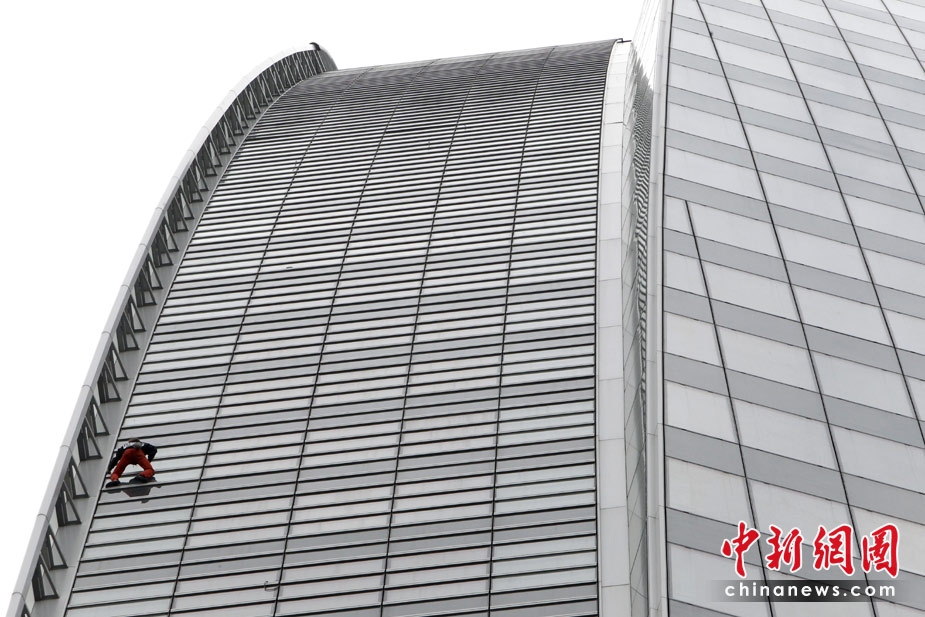 4月7日,巴黎,法國“蜘蛛人”羅伯特當(dāng)日用了大約50分鐘成功攀爬185米高的法國燃?xì)馓K伊士集團大樓。 圖片來源:中國新聞網(wǎng)