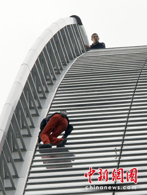 4月7日,巴黎,法國(guó)“蜘蛛人”羅伯特當(dāng)日用了大約50分鐘成功攀爬185米高的法國(guó)燃?xì)馓K伊士集團(tuán)大樓。