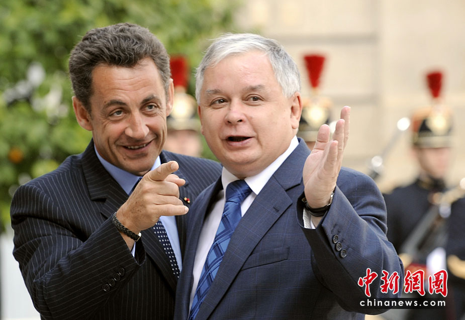 波蘭總統(tǒng)卡欽斯基乘坐的一架圖-154飛機(jī)10日在俄羅斯斯摩棱斯克州北部一軍用機(jī)場(chǎng)降落時(shí)失事,至少87人死亡?J斯基本人被確認(rèn)身亡。圖為2007年波蘭總統(tǒng)卡欽斯基與法國(guó)總統(tǒng)薩科奇。