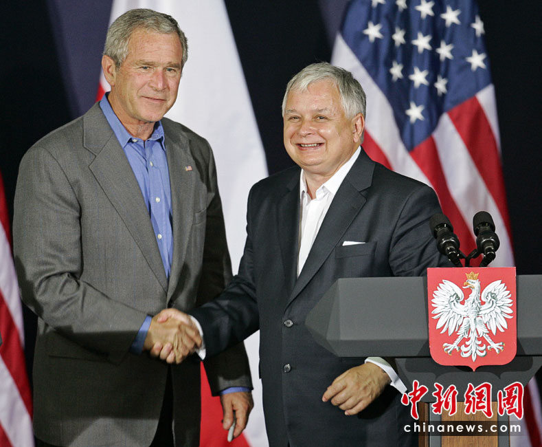波蘭總統(tǒng)卡欽斯基乘坐的一架圖-154飛機(jī)10日在俄羅斯斯摩棱斯克州北部一軍用機(jī)場降落時失事,至少87人死亡。卡欽斯基本人被確認(rèn)身亡。圖為2007年波蘭總統(tǒng)卡欽斯基與美國前總統(tǒng)小布什。