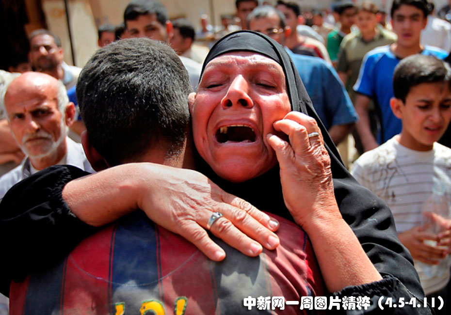 4月6日周二,一名女子在巴格達(dá)市中心的爆炸現(xiàn)場(chǎng)放聲痛哭。全城至少有五枚安放在公寓樓中的炸彈爆炸,還有一個(gè)市場(chǎng)也受到了炸彈的襲擊。