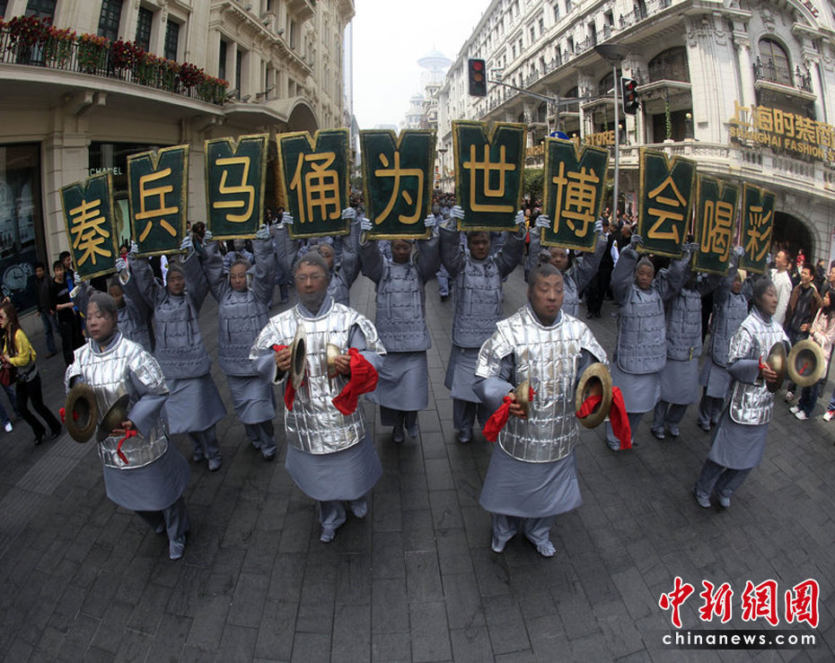 4月10日,由西安旅游局承辦的兵馬俑牽手上海世博會(huì)大型旅游宣傳咨詢活動(dòng)舉行。來自兵馬俑故鄉(xiāng)的百人表演隊(duì)伍,身著灰色的兵馬俑服裝,以鏗鏘的節(jié)奏、雄壯的氣勢,在上海南京東路步行街和東方明珠廣場游演,吸引了大批市民及海內(nèi)外游客駐足觀看。文音/CFP