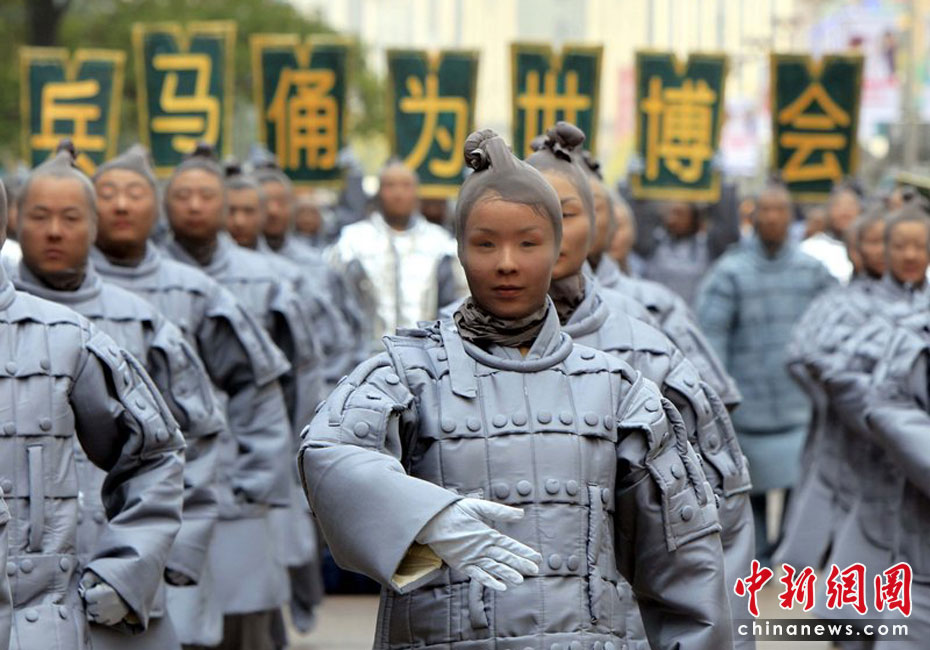 4月10日,由西安旅游局承辦的兵馬俑牽手上海世博會大型旅游宣傳咨詢活動舉行。來自兵馬俑故鄉(xiāng)的百人表演隊(duì)伍,身著灰色的兵馬俑服裝,以鏗鏘的節(jié)奏、雄壯的氣勢,在上海南京東路步行街和東方明珠廣場游演,吸引了大批市民及海內(nèi)外游客駐足觀看。文音/CFP
