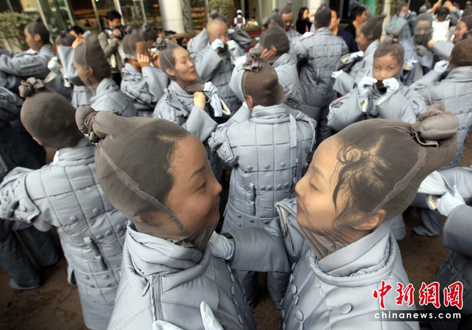 4月10日,由西安旅游局承辦的兵馬俑牽手上海世博會大型旅游宣傳咨詢活動(dòng)舉行。來自兵馬俑故鄉(xiāng)的百人表演隊(duì)伍,身著灰色的兵馬俑服裝,以鏗鏘的節(jié)奏、雄壯的氣勢,在上海南京東路步行街和東方明珠廣場游演,吸引了大批市民及海內(nèi)外游客駐足觀看。文音/CFP