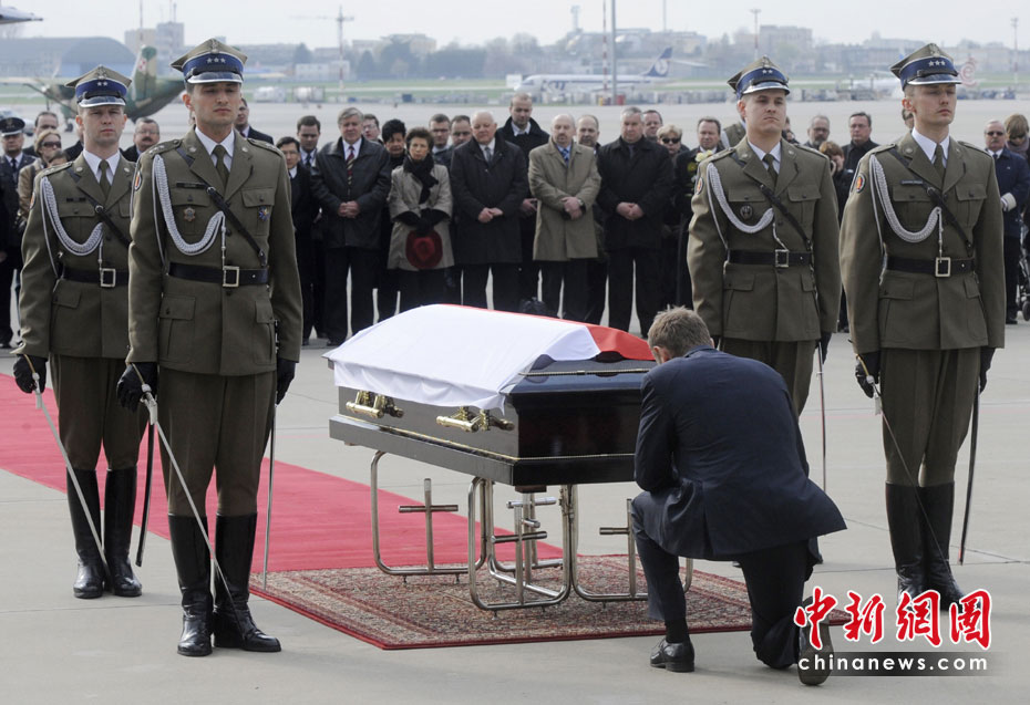 4月10日,卡欽斯基乘坐專機(jī)從華沙飛往俄羅斯斯摩棱斯克市,參加卡廷森林事件70周年紀(jì)念活動。途中飛機(jī)在斯摩棱斯克“北方”軍用機(jī)場附近降落時失事,共造成包括卡欽斯基夫婦及眾多政府高官在內(nèi)的96人死亡。慘劇發(fā)生后,舉世震驚。圖為波蘭總理圖斯克在卡欽斯基遺體前跪拜。