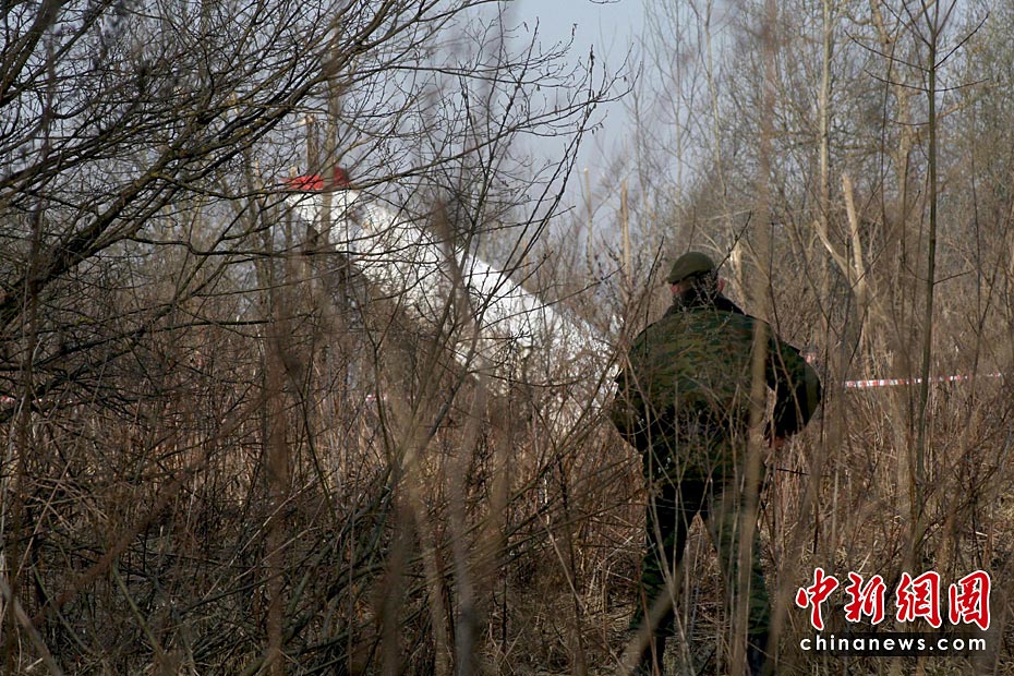 4月11日,波蘭總統(tǒng)卡欽斯基專機在俄羅斯斯摩棱斯克軍用機場墜毀地點附近的道路開通,但是警戒線核心區(qū)仍然關(guān)閉。俄波調(diào)查人員正在現(xiàn)場工作。圖片來源:中國新聞網(wǎng)