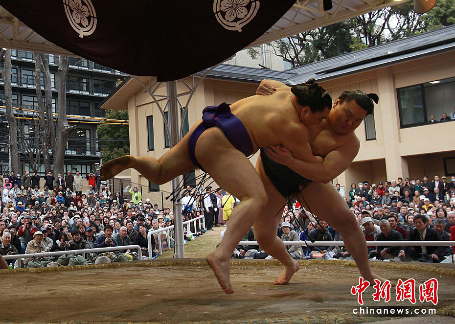 4月9日,來(lái)自世界各地的相撲選手齊聚日本東京靖國(guó)神社內(nèi)的相撲館參加為期一天的日本供奉大相撲比賽。圖片來(lái)源:中國(guó)新聞網(wǎng)