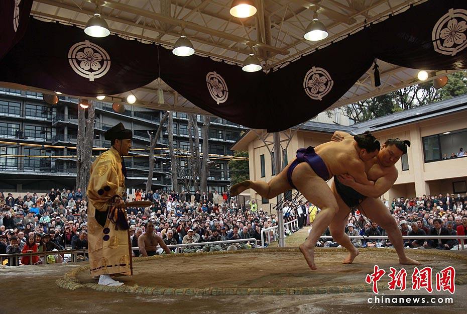 4月9日,來自世界各地的相撲選手齊聚日本東京靖國神社內(nèi)的相撲館參加為期一天的日本供奉大相撲比賽。圖片來源:中國新聞網(wǎng)