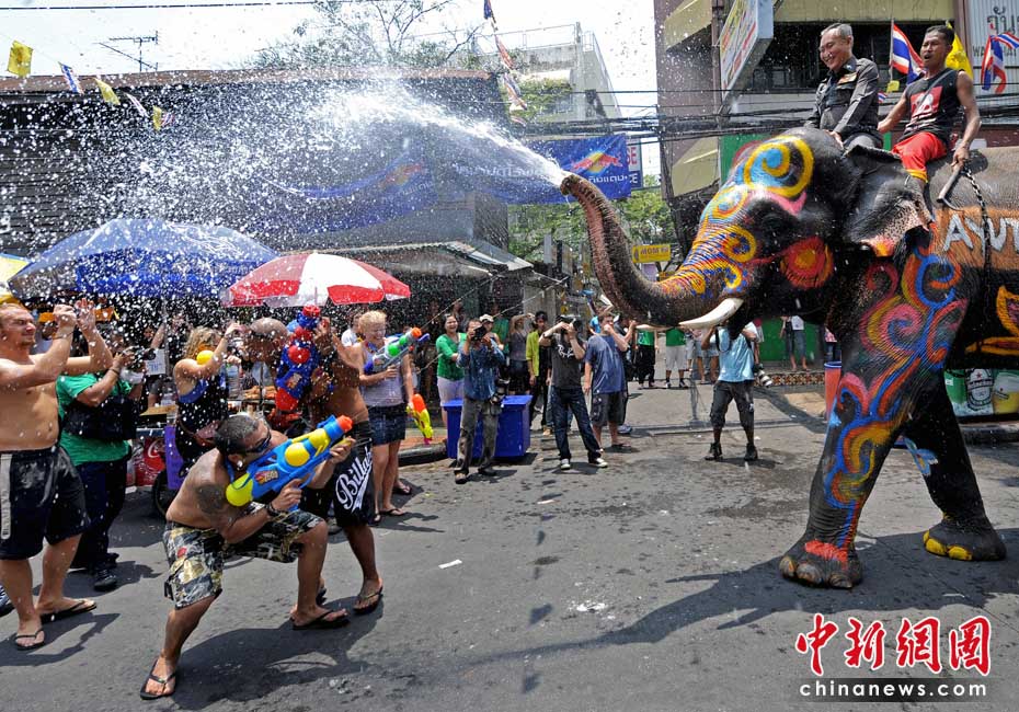4月12日,泰國迎來一年一度的潑水節(jié),在拷桑路旅游區(qū)人們用水槍與大象“互噴”希望為對方送上祝福同時(shí)慶祝泰國新年。圖片來源:中國新聞網(wǎng)
