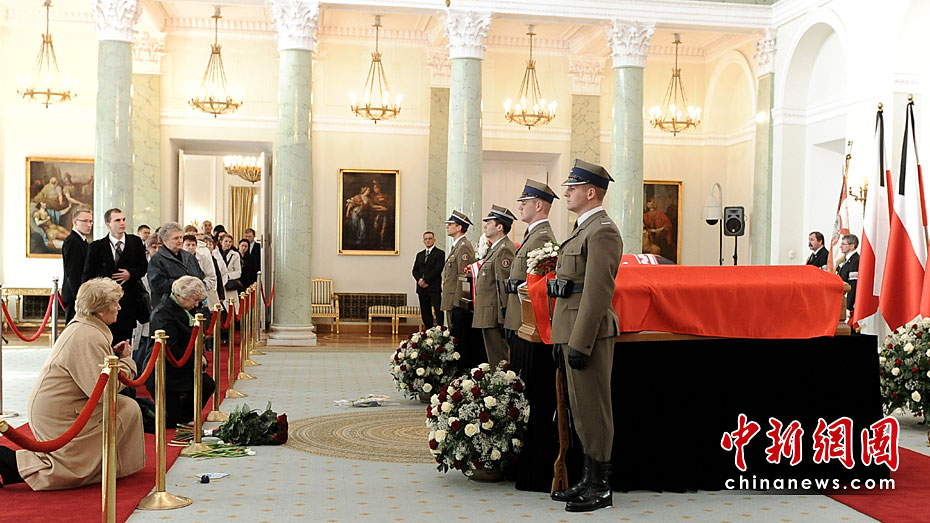 當(dāng)?shù)貢r間4月13日14時,波蘭總統(tǒng)夫婦的遺體被安放在總統(tǒng)府最大的圓柱廳供民眾瞻仰和悼念?偨y(tǒng)卡欽斯基及其夫人的葬禮將于18日舉行。圖片來源:中國新聞網(wǎng)
