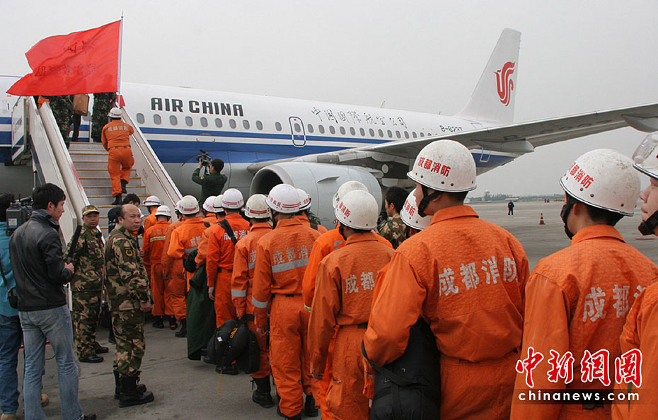 圖為4月14日18時02分和18時08分,國航西南分公司執(zhí)行緊急救援包機(jī)的一架空中客車A319和一架波音757飛機(jī)共搭載302名消防救災(zāi)人員和搜救設(shè)備從成都雙流機(jī)場起飛,火速趕往西寧,將前往青海玉樹7.1級地震震區(qū)救援。中新社發(fā) 易世忠 攝
