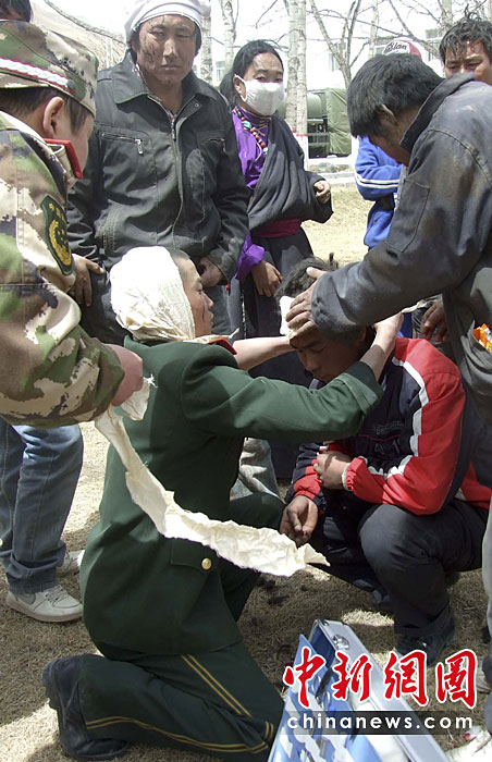 圖為4月14日15時,武警玉樹支隊駐地,一名在地震中受傷的武警戰(zhàn)士救治當(dāng)?shù)厥軅癖姟V行律绨l(fā) 李恩權(quán) 攝