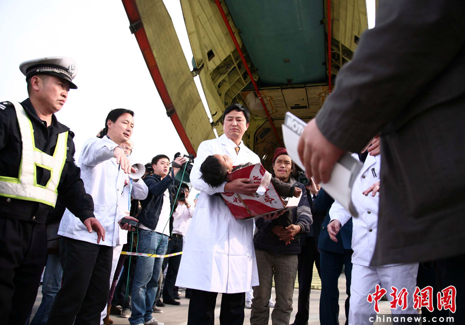 一架載有青海玉樹(shù)地震首批傷員及傷員家屬的中國(guó)空軍運(yùn)輸機(jī)抵達(dá)成都雙流國(guó)際機(jī)場(chǎng),其中35名地震傷員將被分別送往四川省人民醫(yī)院和四川大學(xué)華西醫(yī)院進(jìn)行治療,運(yùn)輸機(jī)于15日下午15時(shí)30分從玉樹(shù)當(dāng)?shù)貦C(jī)場(chǎng)起飛,經(jīng)過(guò)1小時(shí)30分的飛行,歷程800公里,于4月15日下午17時(shí)03分,順利抵達(dá)成都。圖為醫(yī)院搶救人員正將受傷小孩從飛機(jī)抱往救護(hù)車。中新社發(fā) 張浪 攝