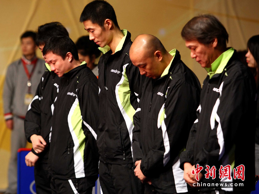4月15日,亞歐乒乓球全明星對(duì)抗賽在北京進(jìn)行第二天的爭(zhēng)奪。賽前,現(xiàn)場(chǎng)所有球員和觀眾為青海玉樹(shù)地震災(zāi)區(qū)的遇難同胞默哀一分鐘,組委會(huì)宣布將把本次賽事的全部票房收入捐贈(zèng)地震災(zāi)區(qū)。中新社發(fā) 富田 攝