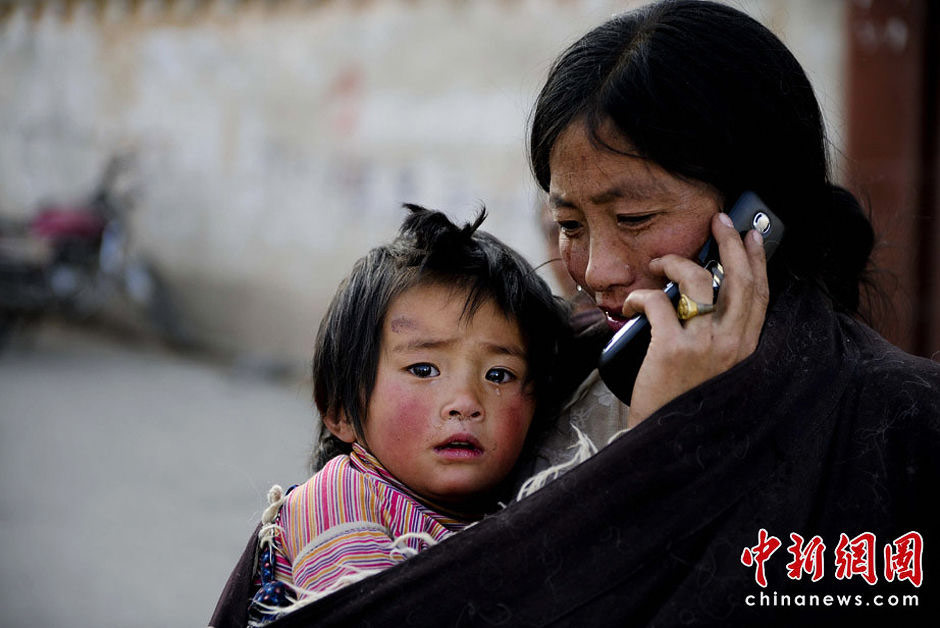 圖為4月15日,青海玉樹縣體育場(chǎng)的地震災(zāi)民安置點(diǎn)內(nèi),一位抱著小女兒的母親在與親人通話時(shí)潸然淚下。中新社發(fā) 廖攀 攝