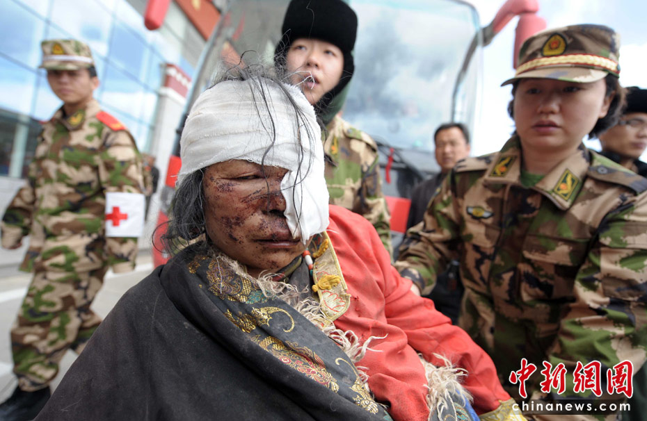 圖為4月15日下午,玉樹地震重傷員用各種交通工具送達(dá)機(jī)場(chǎng),廣東邊防總隊(duì)醫(yī)療救援隊(duì),用被褥接轉(zhuǎn)傷員。中新社發(fā) 陳文 攝