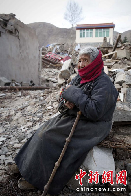 圖為4月15日,青海玉樹(shù),新建路,84歲的老奶奶卓瑪坐在家門口,她說(shuō)她46歲的女兒已經(jīng)在地震中遇難了。(CFP 圖)