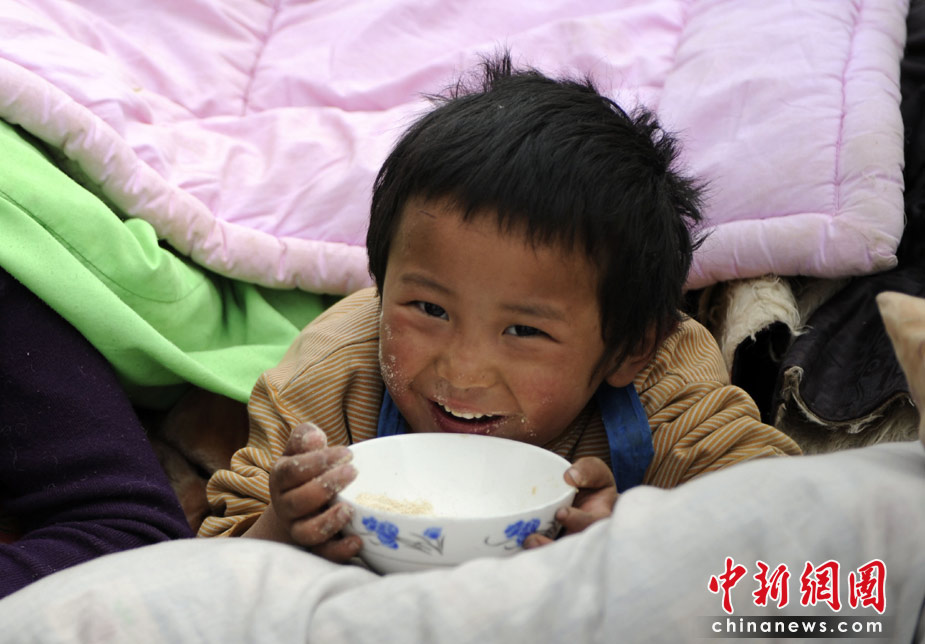 4月16日,青海玉樹體育場(chǎng)地震民眾安置點(diǎn),一名孩童歡快地吃東西。 中新社發(fā) 廖攀 攝