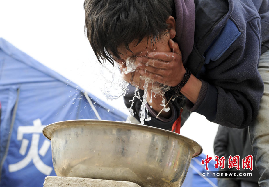 4月16日,青海玉樹體育場地震受災(zāi)民眾安置點(diǎn),一位居民用清水洗臉。隨著救災(zāi)物資的到位,受災(zāi)民眾生活得到基本保障。 中新社發(fā) 廖攀 攝