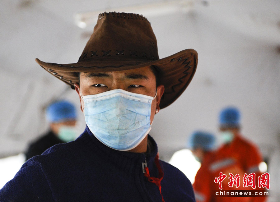 4月16日,青海玉樹體育場武警醫(yī)院醫(yī)療隊帳篷里,一名戴著紅絲帶的志愿者幫助醫(yī)務(wù)人員展開救援。 中新社發(fā) 廖攀 攝
