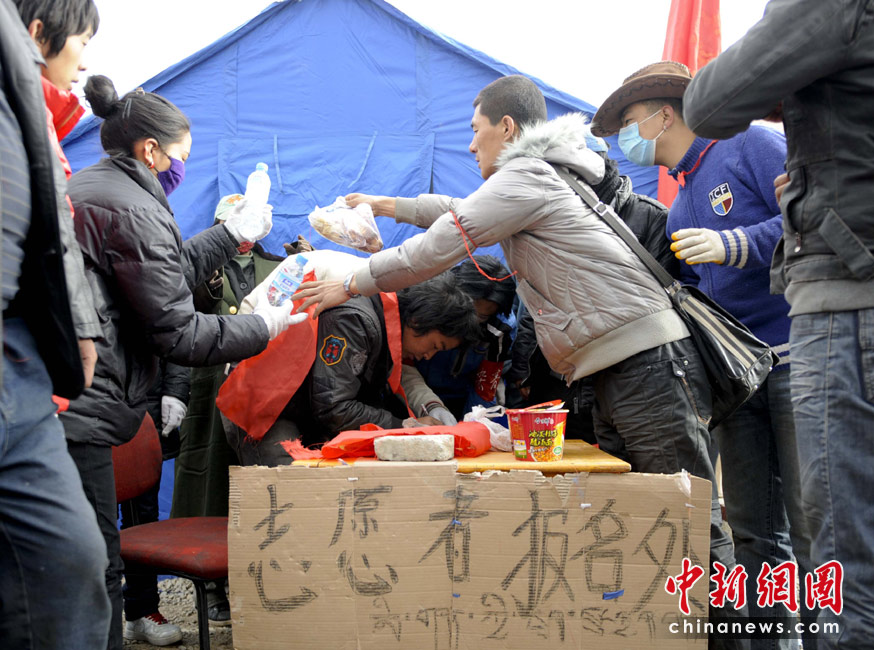 4月16日,青海玉樹體育場受災(zāi)民眾安置點,來自全國各地的志愿者集結(jié)在一起將有序開展幫助救援工作,目前報名人數(shù)已經(jīng)過百。中新社發(fā) 廖攀 攝
