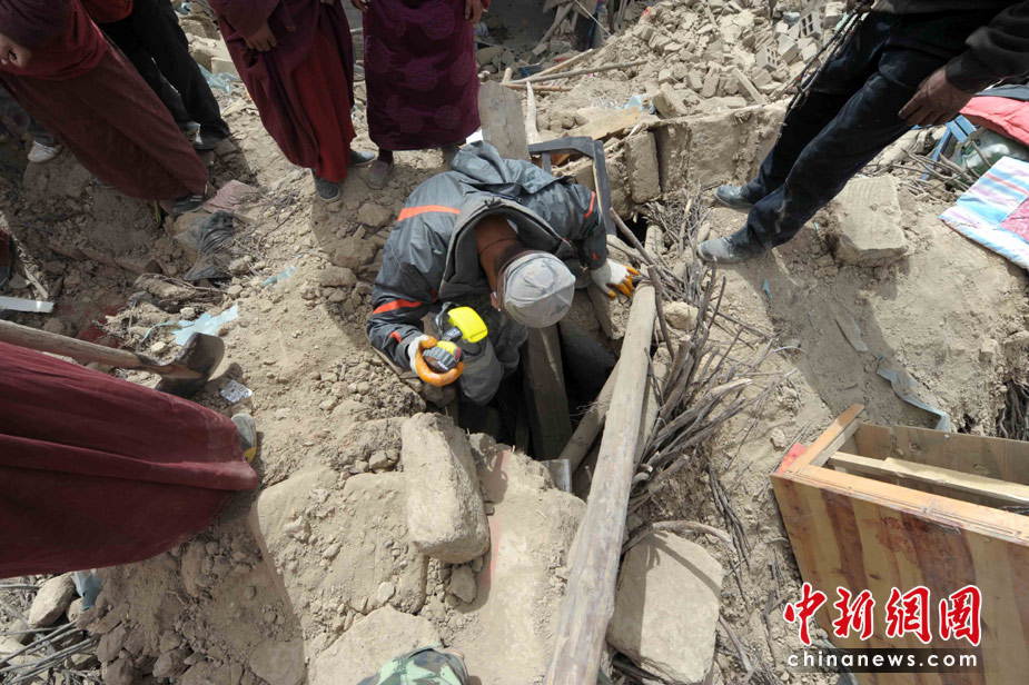 4月16日,青海玉樹地震救援進入第三天,來自蘭州軍區(qū)、山東消防特勤、重慶特勤、廣東邊防總隊、云南邊防總隊、青海民兵等搜救隊連續(xù)搜救,幸存者奇跡生還。中新社發(fā) 陳文 攝