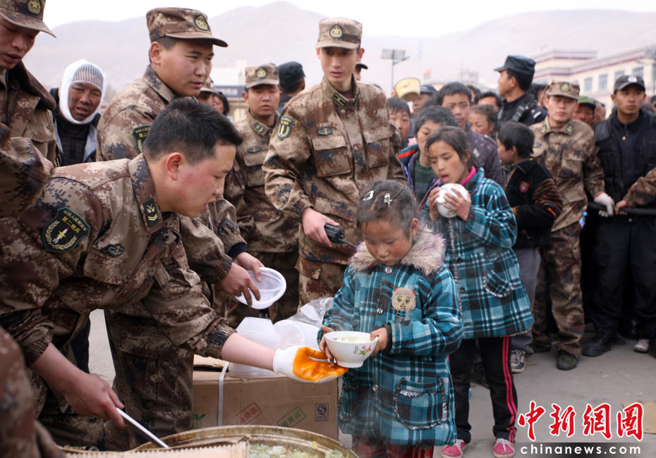 4月16日,青海省玉樹(shù)藏族自治州玉樹(shù)縣地震發(fā)生第三天,為確保災(zāi)民有飯吃、有帳篷住,玉樹(shù)城內(nèi)各個(gè)安置點(diǎn)架起鍋灶為受災(zāi)民眾分發(fā)免費(fèi)食物并幫助搭建帳篷。4月14日07時(shí)49分許,青海省玉樹(shù)藏族自治州玉樹(shù)縣(北緯33.1,東經(jīng)96.7)發(fā)生7.1級(jí)地震。中新社發(fā) 劉忠俊 攝