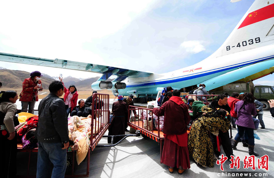 4月16日15時(shí),青海玉樹機(jī)場(chǎng),149名藏族重傷員準(zhǔn)備乘坐廣空運(yùn)輸航空兵某師兩架伊爾-76型運(yùn)輸機(jī)飛往格爾木機(jī)場(chǎng)。中新社發(fā) 沈玲 攝