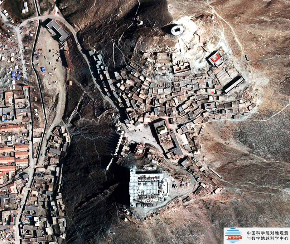 災(zāi)后藏傳佛教寺廟-嘎結(jié)古寺〔由中國(guó)科學(xué)院對(duì)地觀測(cè)與數(shù)字地球科學(xué)中心拍攝〕