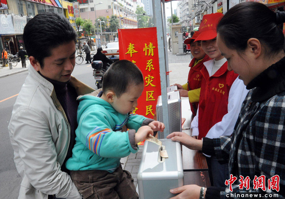 4月17日,一名兒童在家長(zhǎng)的帶領(lǐng)下來(lái)到福州市區(qū)設(shè)立的捐款箱向青海省玉樹(shù)地震災(zāi)區(qū)捐款。當(dāng)日是周六假日,不少福州市民紛紛前往由福建省紅十字會(huì)、福州市紅十字會(huì)、福建慈善總會(huì)等在街頭設(shè)立的捐助點(diǎn),踴躍向青海省玉樹(shù)地震災(zāi)捐款。中新社發(fā) 劉可耕 攝