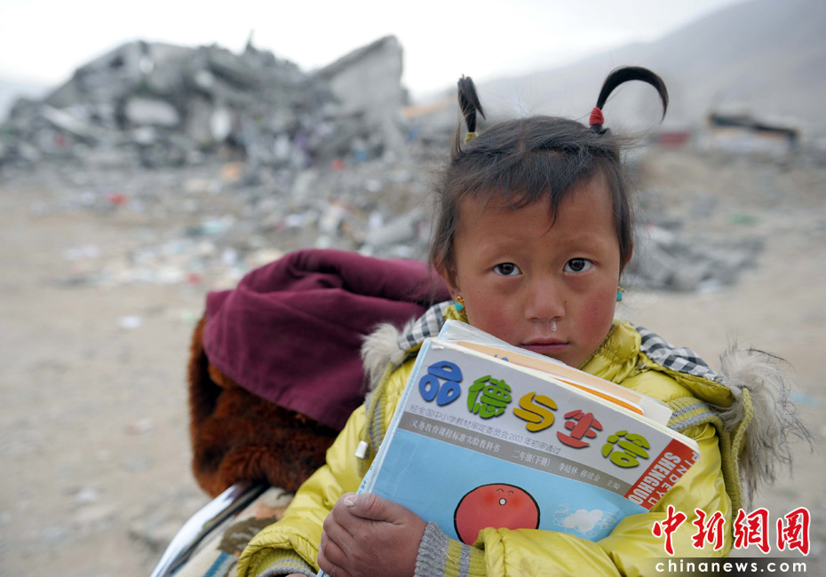 4月17日,一位上小學(xué)二年級(jí)的女童緊抱著自己的課本,站在震后的廢墟前。4月17日上午,青海省民政廳廳長更陽向媒體發(fā)布了一系列安撫救濟(jì)措施,災(zāi)民生活補(bǔ)助按每人每天15元,每一個(gè)死亡人員家庭補(bǔ)助8000元,“三孤”指孤老、孤殘、孤兒補(bǔ)助每人每月1000元,孤兒補(bǔ)助到18歲止。中新社發(fā) 陳文 攝
