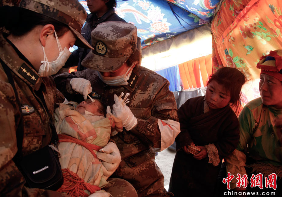 4月18日,總后青藏兵站部抗震醫(yī)療隊(duì)在青海玉樹震中結(jié)古鎮(zhèn)展開救援的同時(shí),還派員向周邊牧區(qū)巡診,救治傷病員。圖為醫(yī)務(wù)人員為黃林格頭牧區(qū)索南求幾的嬰兒進(jìn)行檢查和護(hù)理。據(jù)悉,這個(gè)牧區(qū)所有房屋在地震中被損毀,不少牧民在地震中受傷,目前住在搭建的帳篷里。中新社發(fā) 鄒小慶 攝